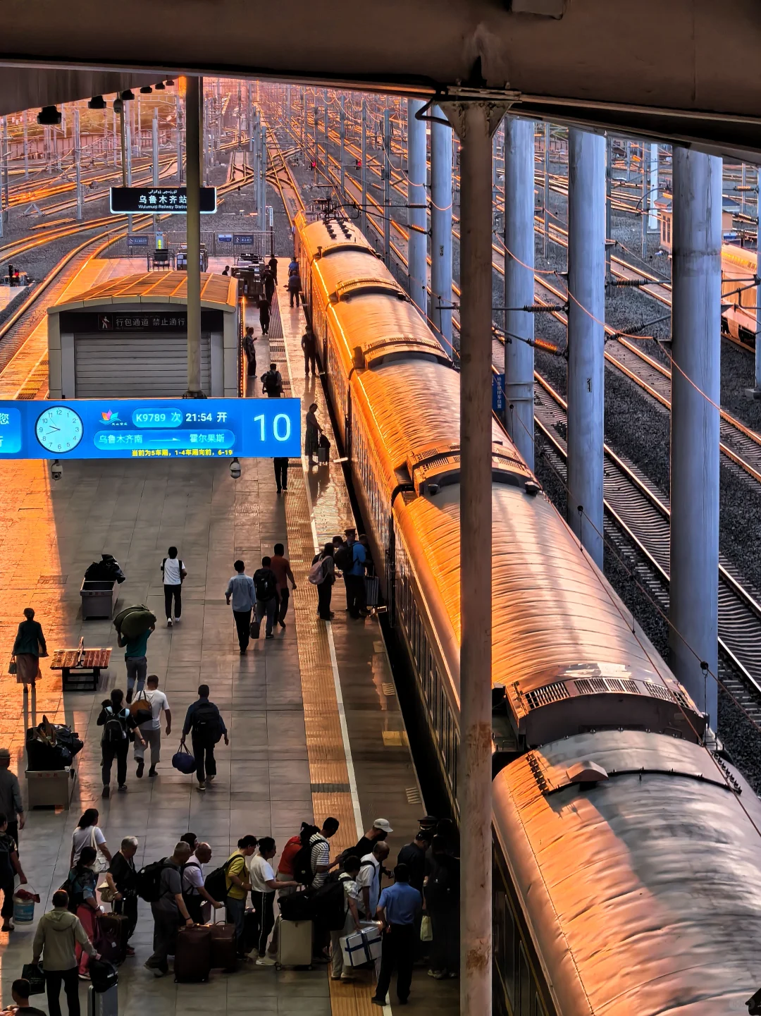列车缓缓停靠,窗外的站台灯光在暮色中晕开成片片橙黄,对新疆的期待,从地图上的色块渐渐在眼前清晰起来;拖着行李的旅人从车厢涌出,天南地北口音在此相遇、交织,各自探寻一段属于自己的新疆篇章。