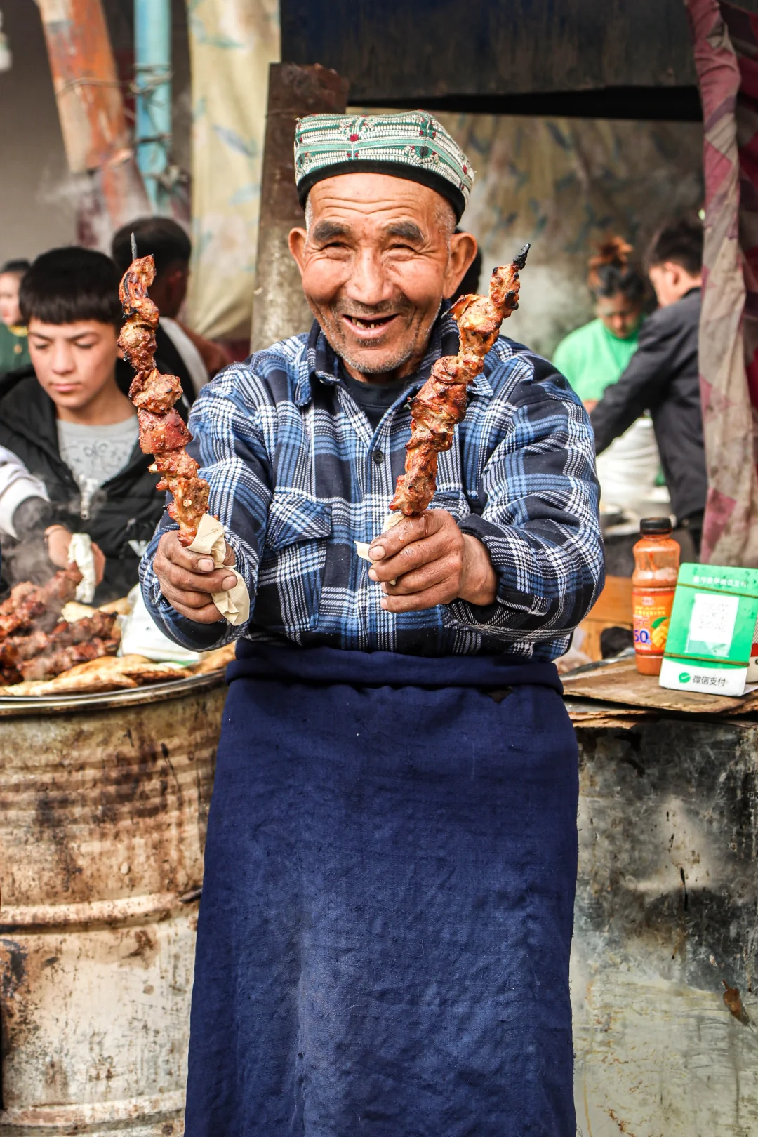 而喀什的魂,藏在城外的牛羊大巴扎里。维吾尔老爷爷将肉串高高举起,炭火噼啪作响。他眯着眼,皱纹像叶尔羌河干涸的河床,却在望向你来时,盛着塔克拉玛干落日般热烈而质朴的光。这里的一切,都带着久违的、人与人之间毫无保留的温暖触感。