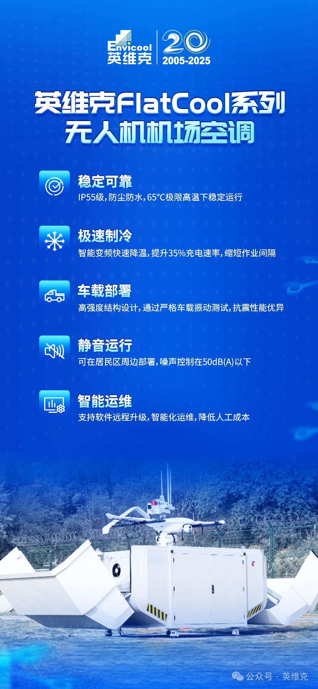 英维克FlatCool低空温控解决方案,以稳定可靠、高效制冷、灵活部署、低噪静音为核心,全面覆盖固定与移动部署场景,为低空经济基础设施构建起坚实的热管理防线。