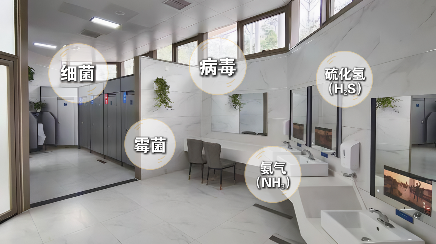 公共卫生间普遍存在空间密闭、自然通风条件差、高湿低光照的先天环境局限。传统通风系统布局繁琐,效果受外部条件制约明显;活性炭等吸附式滤材在高湿环境下极易快速饱和失效,均难以长久适配该类复杂场景。