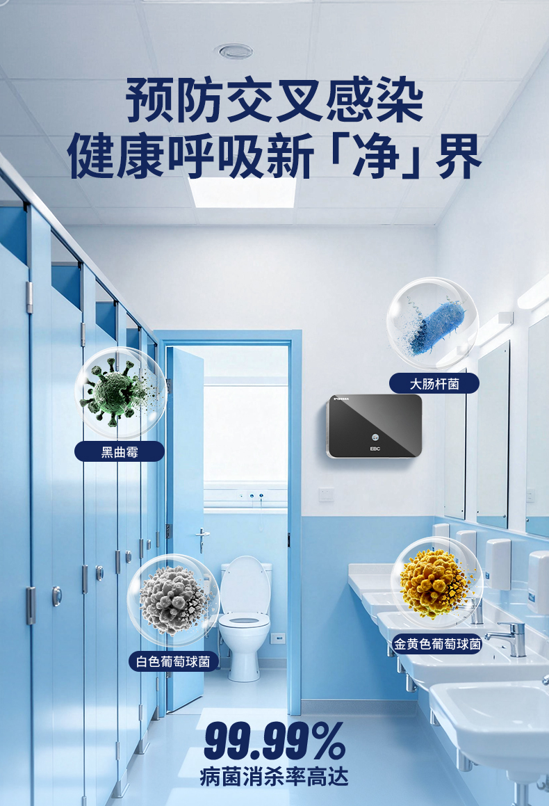 无论是北京首都国际机场这样的核心交通枢纽,还是医院、学校、办公场馆、商业空间......EBC空气消毒除臭机在全场景公共卫生间均展现出超强的适配能力。