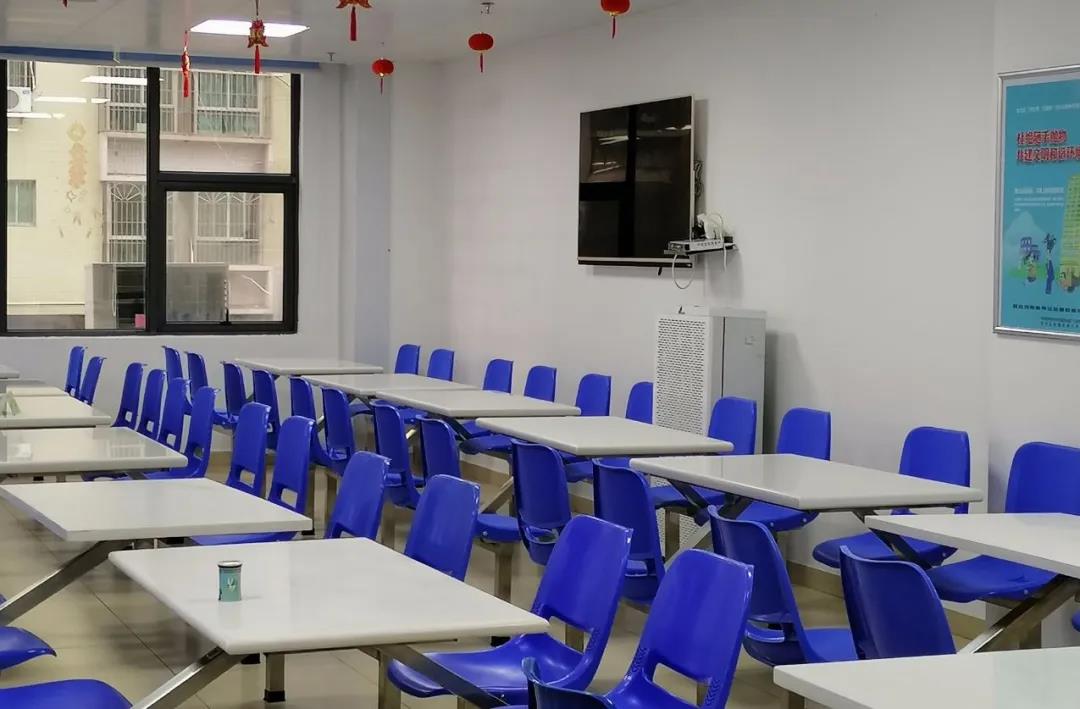 一般的裸露紫外线灯不能在食堂就餐时间使用,而且它只起到消毒作用,不具备净化空气中的传播介质的作用,病毒可通过飞沫等颗粒物进行扩散。而最容易形成飞沫的时间就是就餐时段,该阶段可考虑空气消毒净化机这类型的空气消毒设备,挑选循环风量更大的,通过大风量净化系统快速滤除飞沫、气溶胶传播介质,配合消毒功能实现双重消毒。
