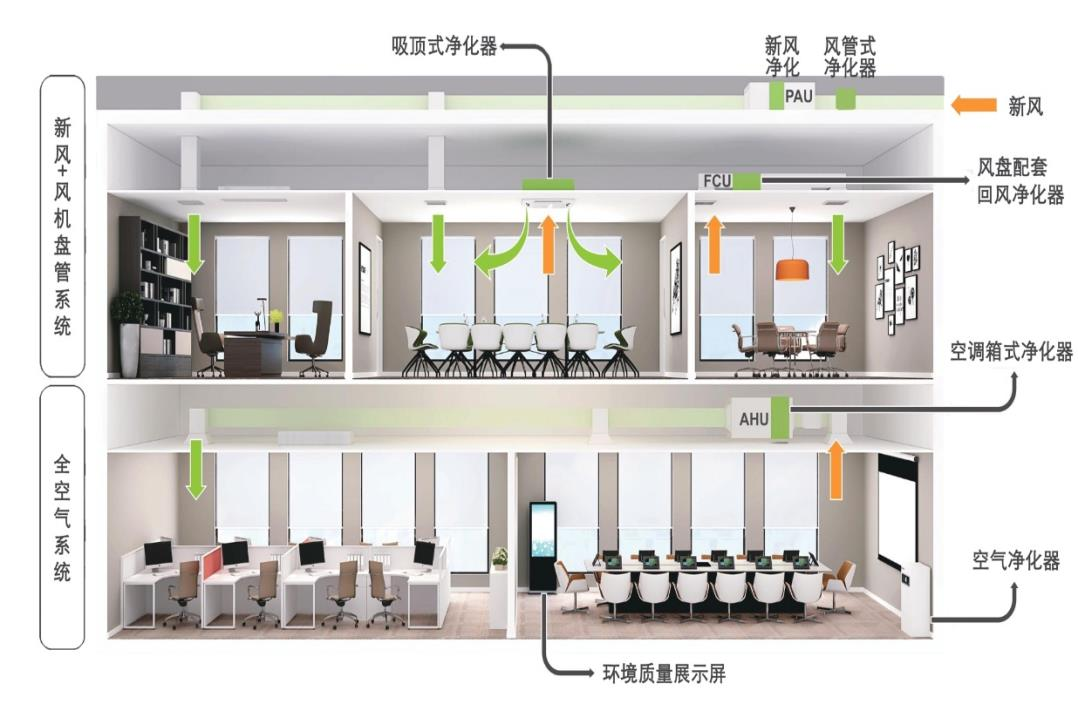 在当前大气污染问题日益严重、新冠肺炎滋扰的背景下,结合《新冠肺炎流行期间办公场所和公共场所空调通风系统运行管理指南》和《办公建筑应对“新型冠状病毒”运行管理和使用应急措施指南》等相关文件要求,进一步提高室内空气品质,消除办公大厦内部PM2.5 和气溶胶,科学合理使用空调通风系统,防止因空调通风系统使用不当而导致细菌和病毒传播和蔓延,最大限度的保护使用者。