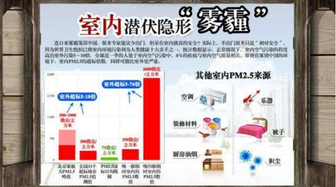 我们都知道雾霾是一种大气污染现象,其中PM2.5就是雾霾的主要构成成分,会对人体的呼吸系统和心血管系统造成伤害。但是你知道吗?除了室外有PM2.5,其实室内也有PM2.5,如果室内通风不畅,一旦出现PM2.5过高,其实室内的PM2.5比室外的雾霾对人体的伤害可能更大,因为是一个长时间的侵害过程。