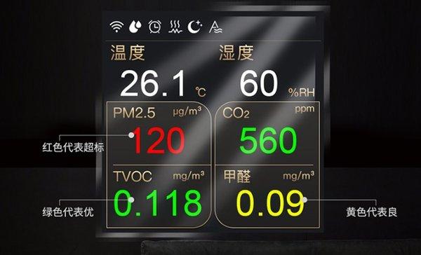 当室内空气优秀时,数据的颜色为绿色;当室内空气良好时,数据显示黄色;当室内空气超标时,数据显示红色,家里空气的好坏用户一眼就能看明白,这个功能设计对于家庭用户来说比较人性化。