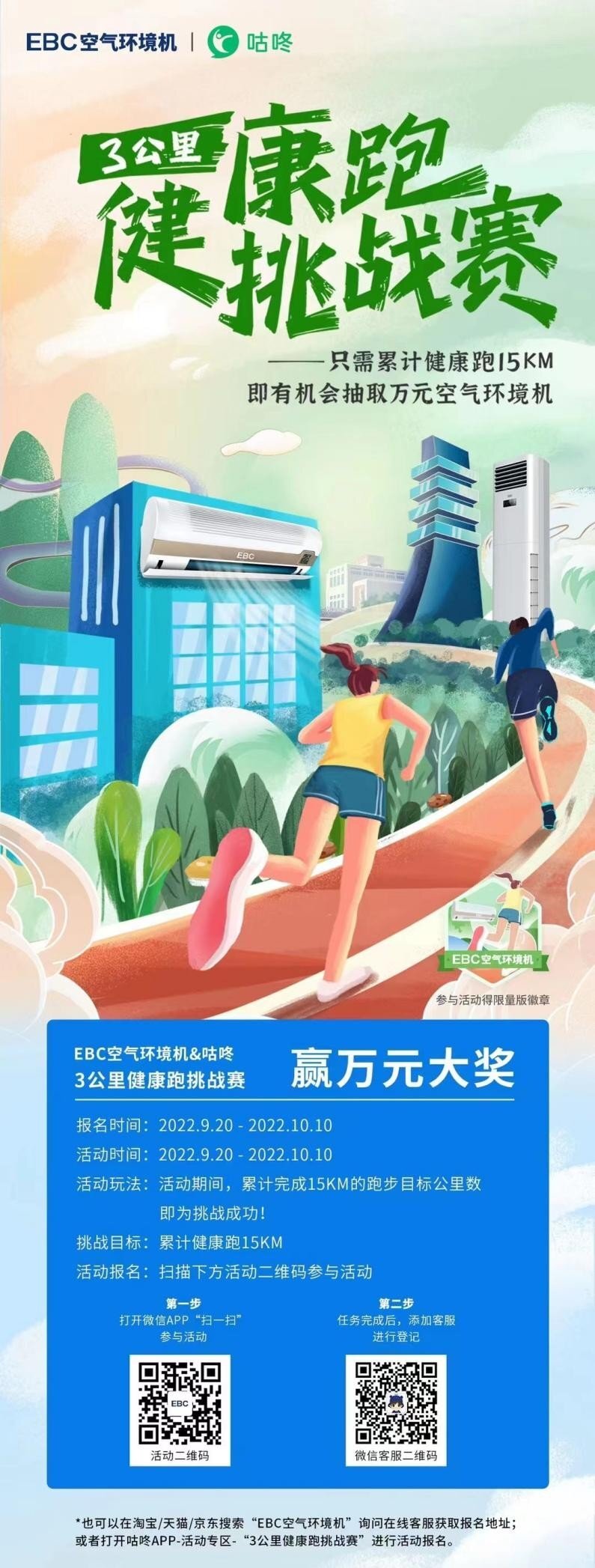 随着人民健康意识的提升,“健康生活方式”已经成为近年来民众最为关心的社会议题之一,为了响应全面建设健康中国的号召,EBC空气环境机将于9月20日至10月10日,联手智能运动社交平台“咕咚”,举行“健康跑挑战赛”活动,相约广大民众健康跑起来。