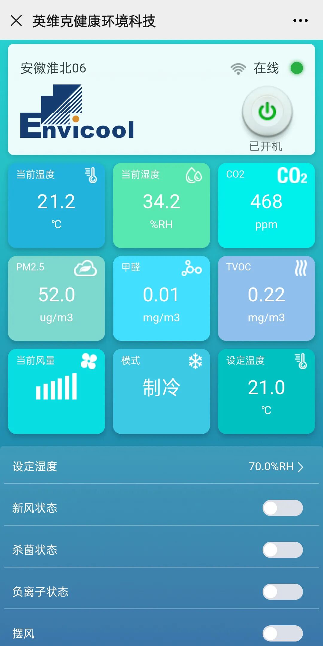 主要功能:空气监测、温控、新风、空气消毒杀菌、空气净化