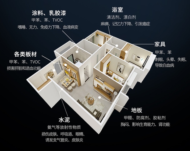 我们的生活空间里是由各种装修材料组成,如墙纸、涂料、板材等,它们的存在不乏胶的链接。由此推出,甲醛的存在也是变得是可以理解的客观现象。甲醛可通过呼吸道系统、消化系统、皮肤系统,对人体造成侵害。对神经系统产生影响,诗人感到不舒适,注意力分散,工作效率降低头痛、恶心、疲劳、皮肤红肿等,严重时会造成婴儿畸形、白血病和多种癌症等。
