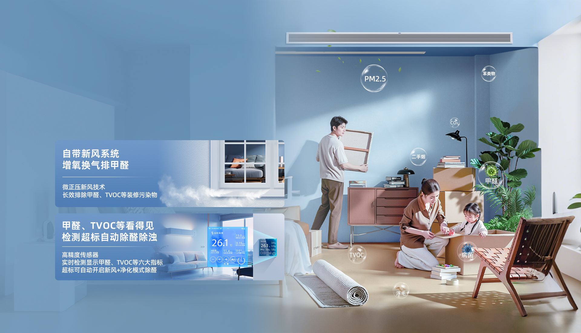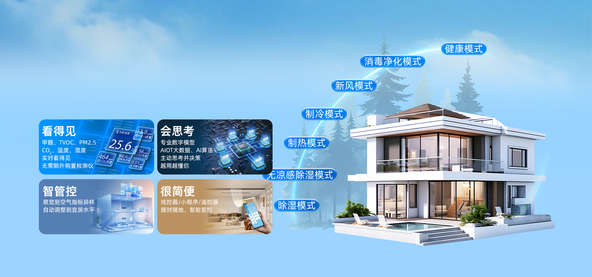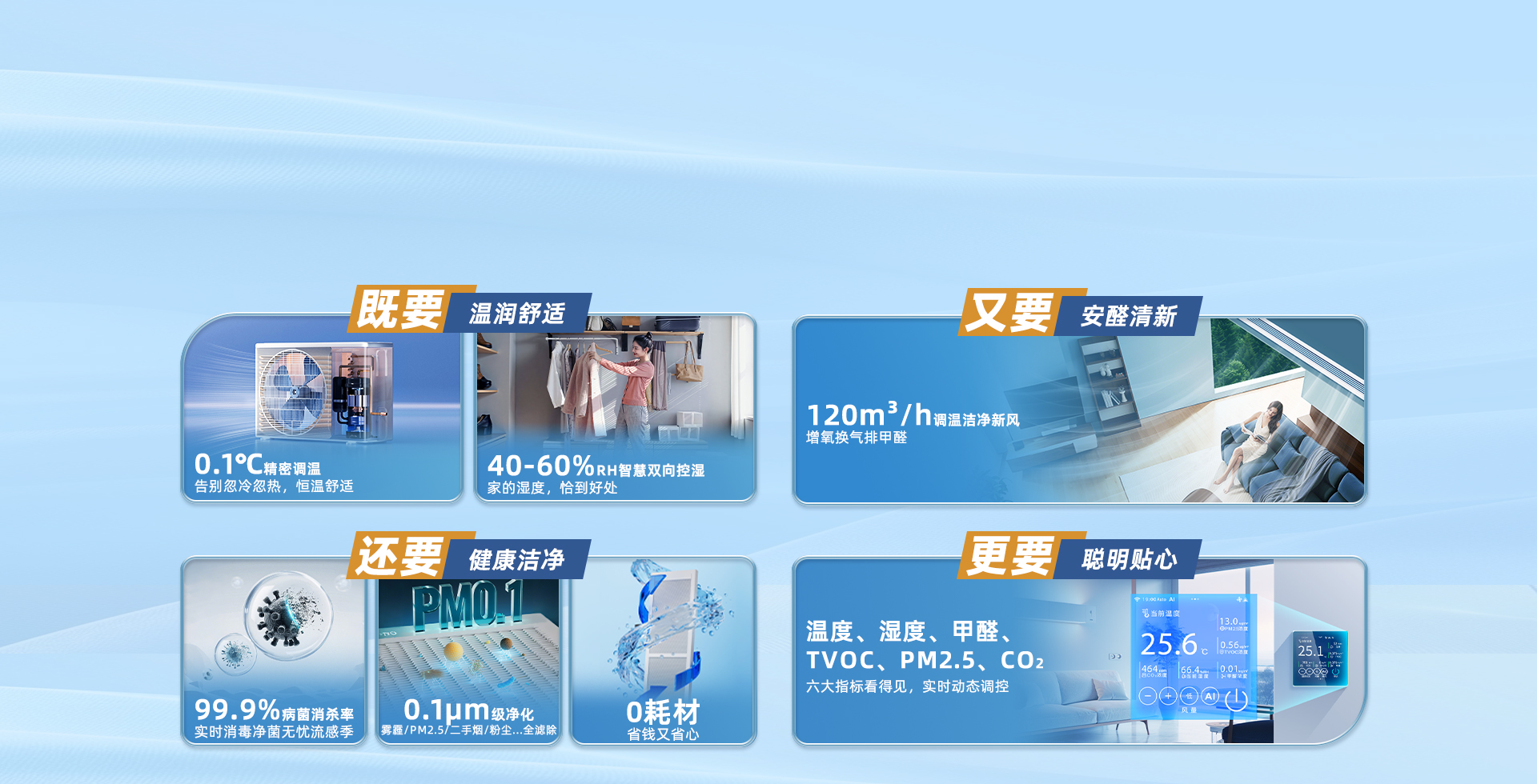 六合一空气管理专家,集成空调、新风、净化、消毒、除湿、监测功能,创新0.1℃精密温控与0耗材水洗净化技术,医护级消毒灭活率>99%。120m³/h新风排醛,35dB超静音运行,智能恒湿节能省电,全方位解决家庭空气健康问题。